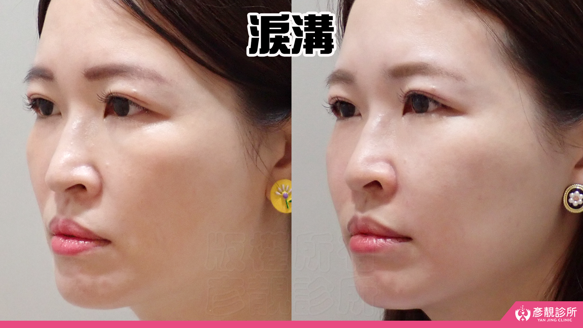 除了法令紋,還有一個困擾我超級久的問題,右眼下方淚溝處凸起來,原因是結婚時在別間診所打的玻尿酸